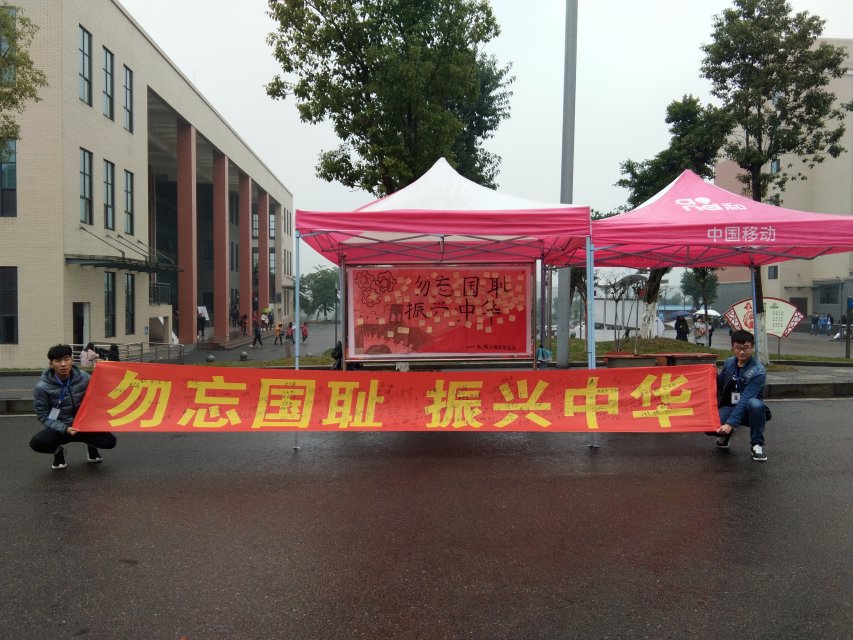 12月13日为南京大屠杀死难者公祭日,为倡导大学生勿忘国耻、缅怀先烈,机械系青年站在学院食堂十字路口举办关于“勿忘国耻,振兴中华”的主题活动。