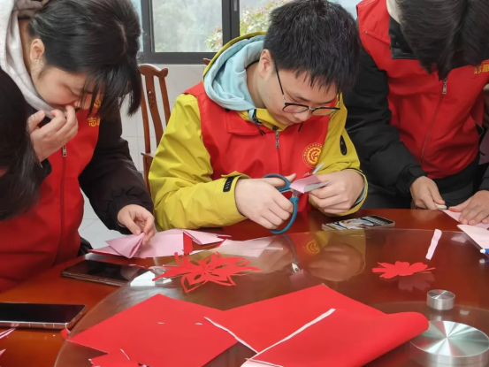 志愿者们准备了色彩缤纷的彩纸与锋利的剪刀,志愿者们会耐心地向老人们讲解剪纸技巧,从简单的折叠方法到小心剪裁的角度,一步步引导。老人们全神贯注,用微微颤抖的双手尝试剪出各种图案,或是象征吉祥的福字,或是灵动的花鸟。每一次成功剪出图案,大家脸上都洋溢着喜悦,剪纸不仅锻炼了老人的动手能力,更成为志愿者与老人亲密互动、交流情感的桥梁。