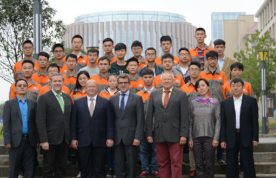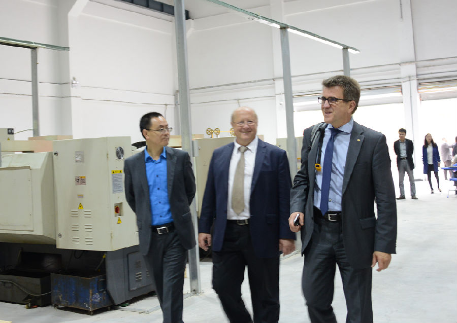 10月12日上午,在参加完由泸州市教育局和我们共同承办的“中德职业教育合作论坛”后,德累斯顿工业大学资深教授、大学决策委员会成员、德国工程教育协会秘书长Prof.Dr.Hanno Hortsch,德累斯顿工业大学职业教育和继续教育学院院长Mrs.Yongqiang Tong,德累斯顿手工业联合会(HWK)主席Dr.Stephan Dittrich,德累斯顿手工业联合会(HWK)副总经理 Mr.Karl-Heinz Herfort,德累斯顿职业学校中心校长 Mr.Bernd Petschke一行在院长贺元成、机械工程系主任张安民的陪同下,来到机械工程系检查指导双方合作开办的中德班教学工作开展情况。