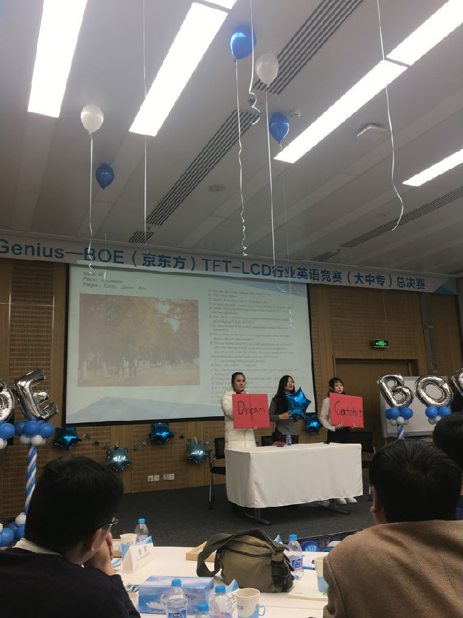 据悉,京东方公司是一家集显示器、智慧系统和健康服务为核心的公司,该公司生产的显示屏市场占有率全球第一,每年我们有大量学生到京东方工作,是我们的校企合作单位。本次比赛由京东方公司于2016年5月开始筹备初赛,有来自全国南方赛区和北方赛区共计3000多名选手参赛,经过选拔有45支代表队进入半决赛,半决赛由专业词汇考核、穿防尘服等多个环节构成。冯明月及其团队一路过关斩将,冲入只有20个名额的全国总决赛。总决赛主要考察选手的英语发音、表现力和随机应变能力,最终她们的表演获得专业评委的一致认可。比赛结束后,京东方公司人事总监亲自找到我们代表队,热情邀请团队3位学生加入京东方,并承诺只要学生愿意来京东方,可以任选京东方各区域分公司。