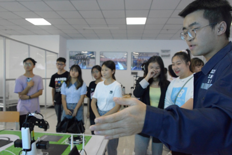 活动现场,机器人协会人员为同学们介绍机器人组成结构和普及机器人的编程知识,让学生们在实境中沉浸式感受到机器人在智能制造领域的发展和应用。