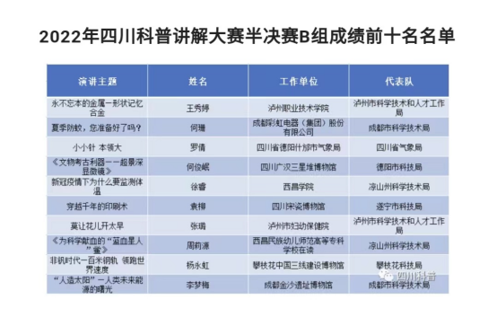 本次大赛自今年3月启动以来,学校积极响应,精心组织申报和遴选,积极推荐优秀选手参加泸州市选拔,在泸州市科普讲解大赛中,我们师生共获一等奖1项,二等奖1项,优秀奖1项,其中球盟会官方网站教师王秀婷被推选代表泸州市参加四川省科普讲解大赛决赛。